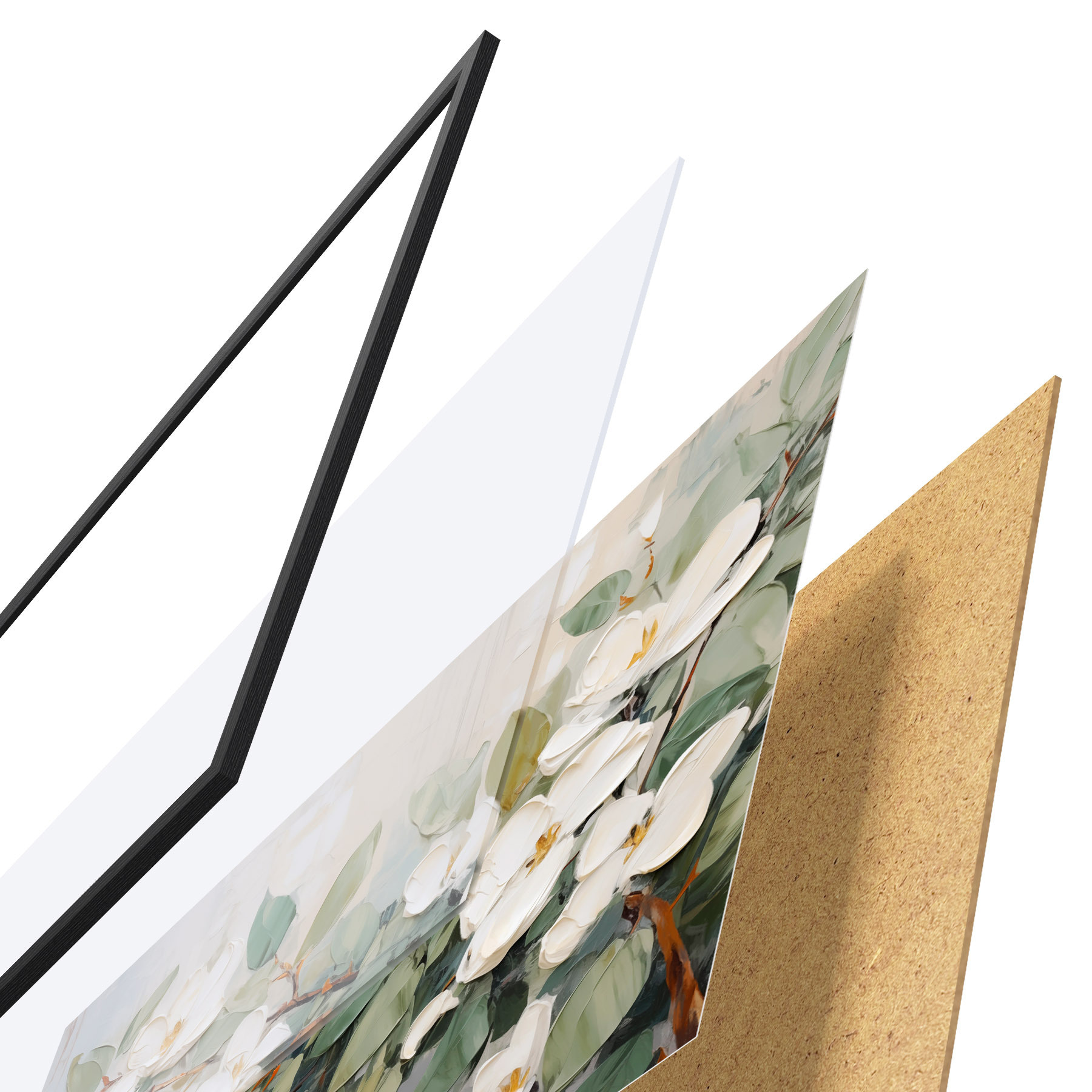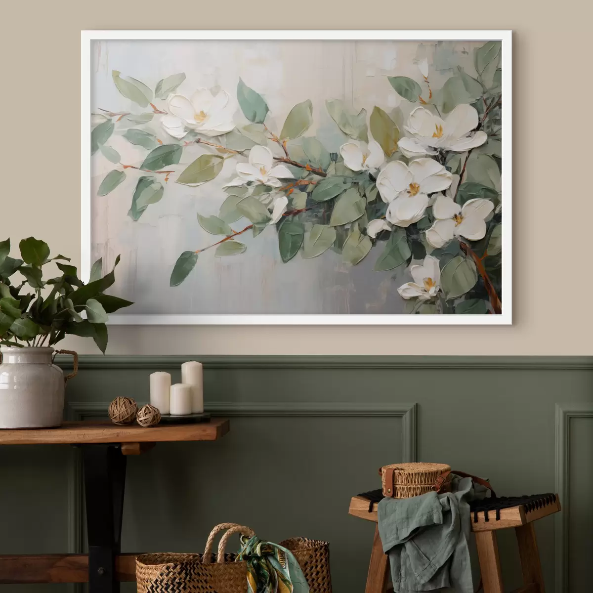 Poster Květy magnólie se zelenými listy na větvi, impasto texturovaný styl, jemná barevná paleta f44853