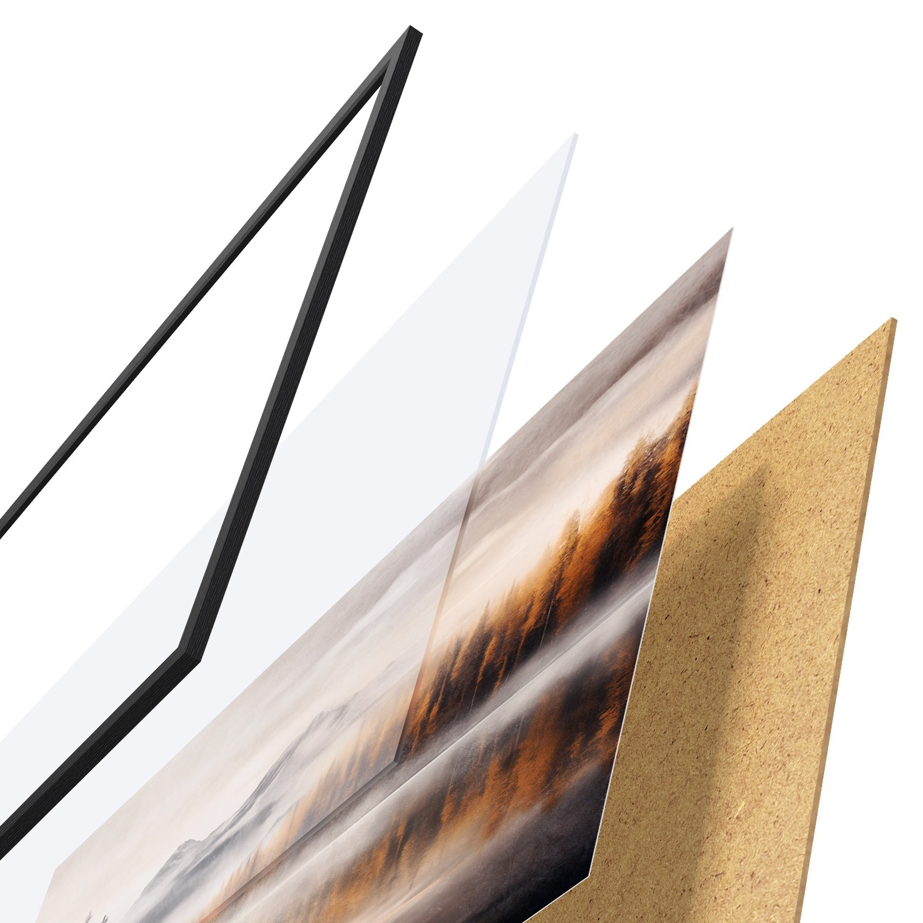 Plakát se skládá z rámu, plexiskla, tištěného obrazu a dřevotřískového podkladu. Díky úchytům na zadní straně lze plakát ihned zavěsit na zeď.