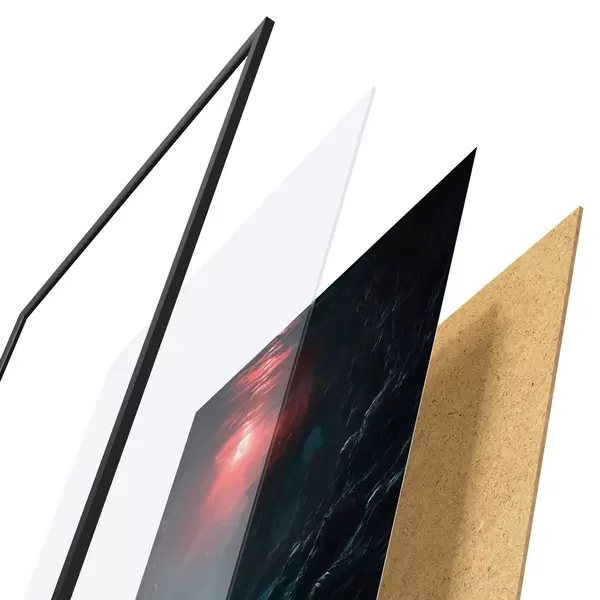 Plakát se skládá z rámu, plexiskla, tištěného obrazu a dřevotřískového podkladu. Díky úchytům na zadní straně lze plakát ihned zavěsit na zeď.