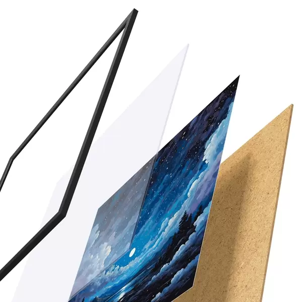 Plakát se skládá z rámu, plexiskla, tištěného obrazu a dřevotřískového podkladu. Díky úchytům na zadní straně lze plakát ihned zavěsit na zeď.