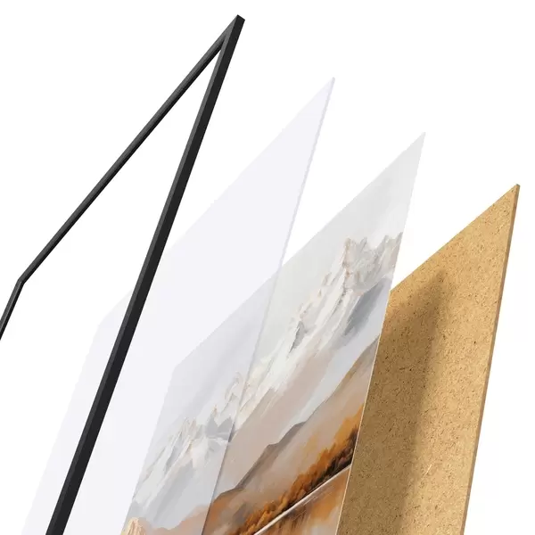 Plakát se skládá z rámu, plexiskla, tištěného obrazu a dřevotřískového podkladu. Díky úchytům na zadní straně lze plakát ihned zavěsit na zeď.