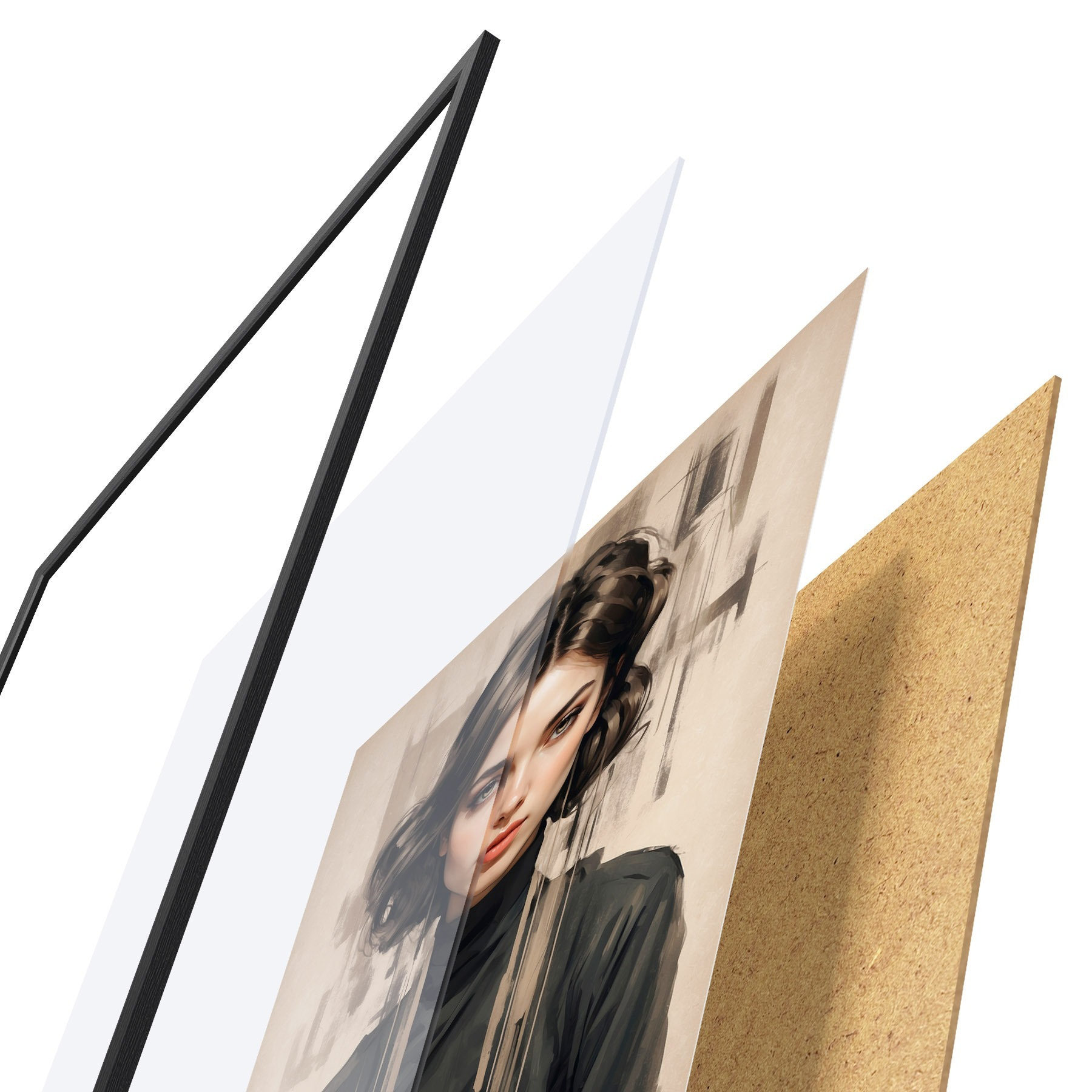 Plakát se skládá z rámu, plexiskla, tištěného obrazu a dřevotřískového podkladu. Díky úchytům na zadní straně lze plakát ihned zavěsit na zeď.