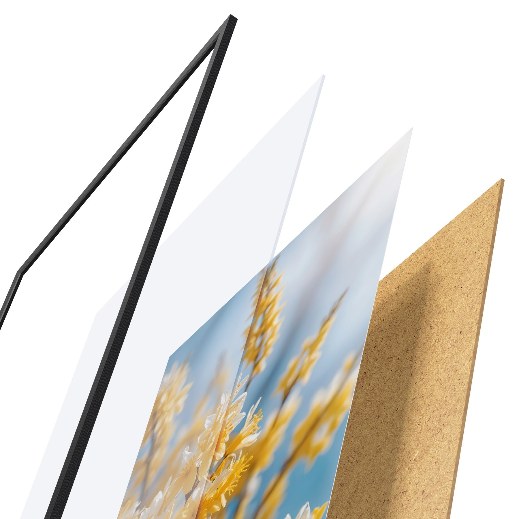 Plakát se skládá z rámu, plexiskla, tištěného obrazu a dřevotřískového podkladu. Díky úchytům na zadní straně lze plakát ihned zavěsit na zeď.