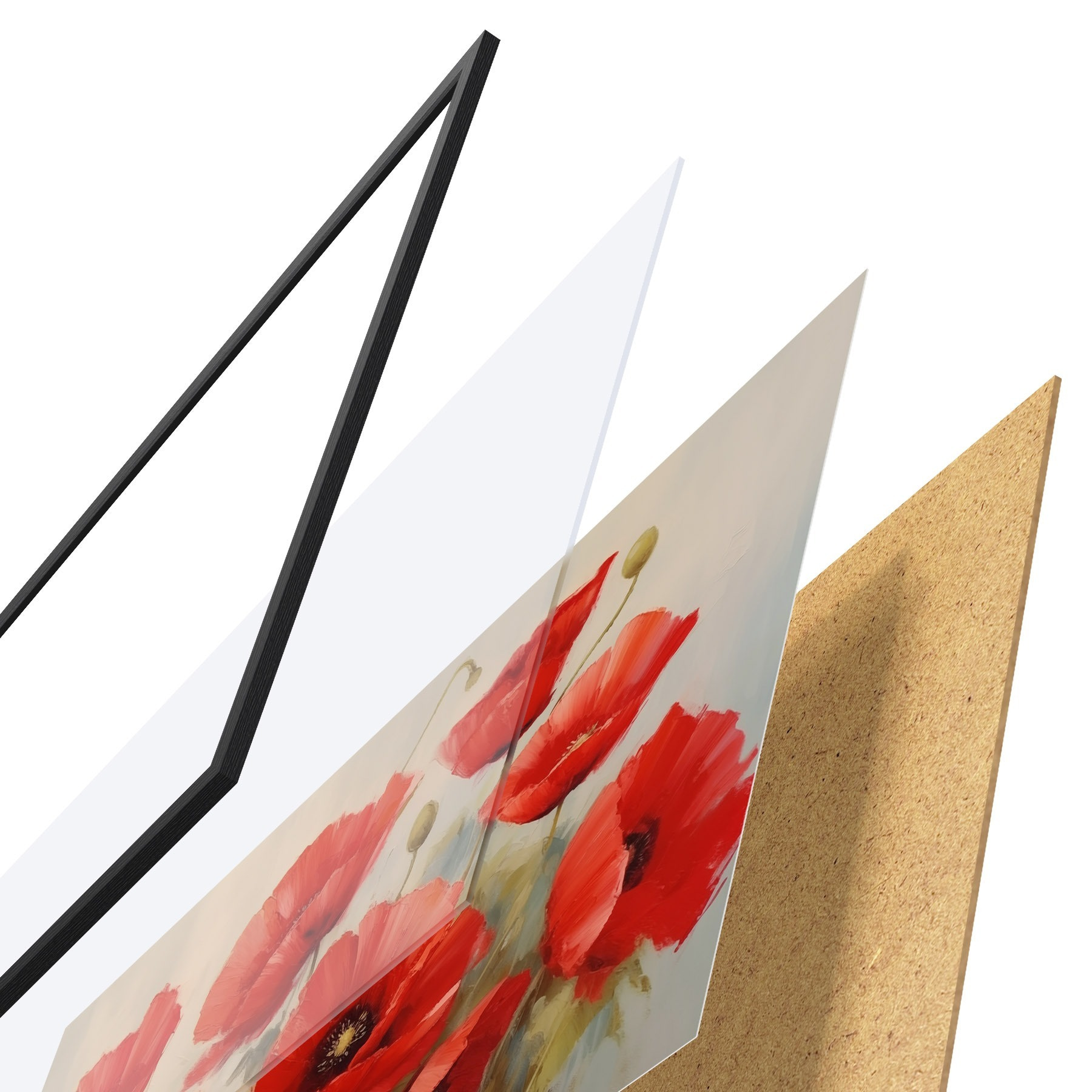 Plakát se skládá z rámu, plexiskla, tištěného obrazu a dřevotřískového podkladu. Díky úchytům na zadní straně lze plakát ihned zavěsit na zeď.
