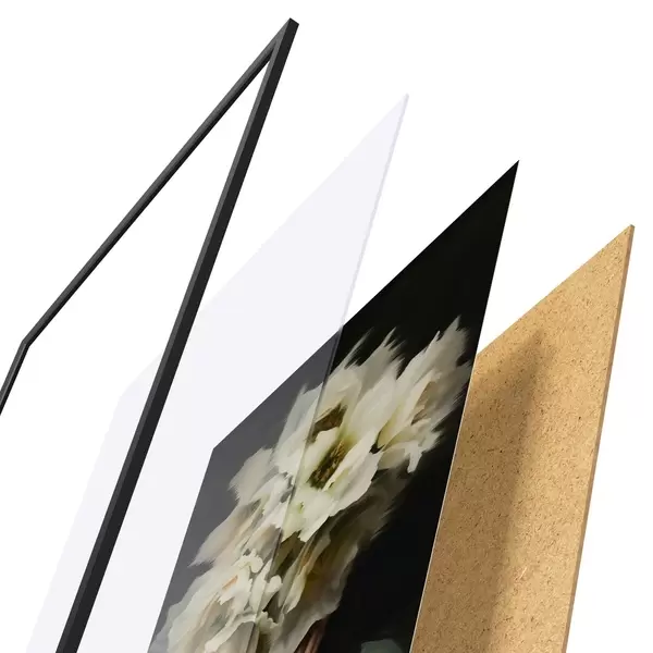 Plakát se skládá z rámu, plexiskla, tištěného obrazu a dřevotřískového podkladu. Díky úchytům na zadní straně lze plakát ihned zavěsit na zeď.