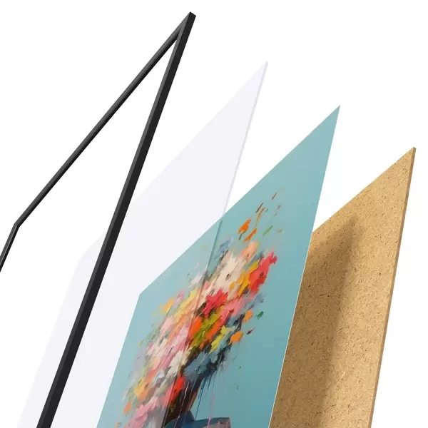 Plakát se skládá z rámu, plexiskla, tištěného obrazu a dřevotřískového podkladu. Díky úchytům na zadní straně lze plakát ihned zavěsit na zeď.