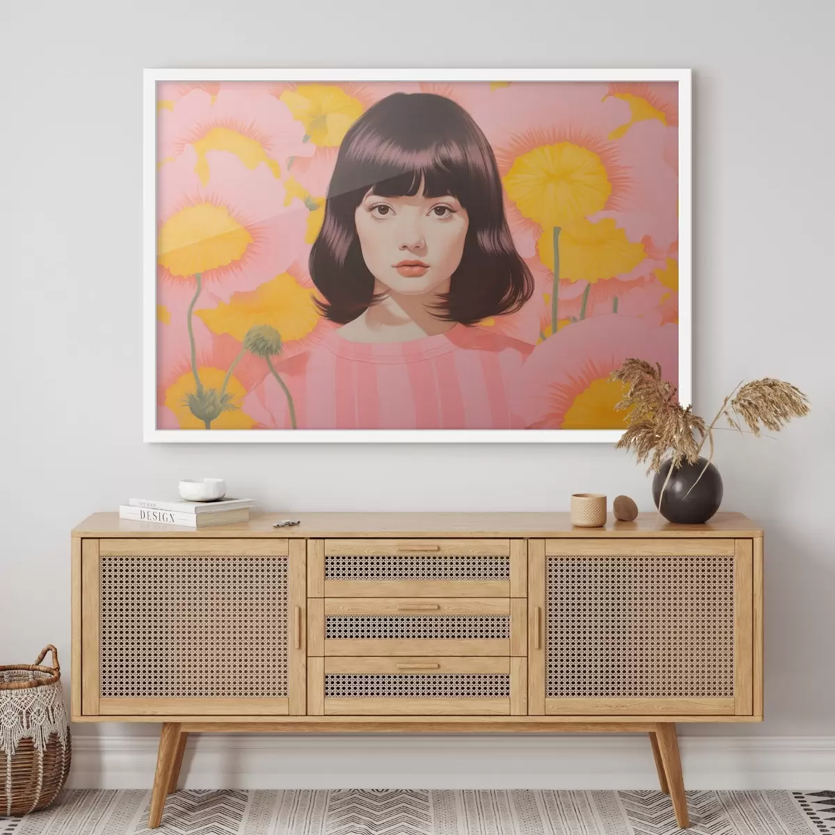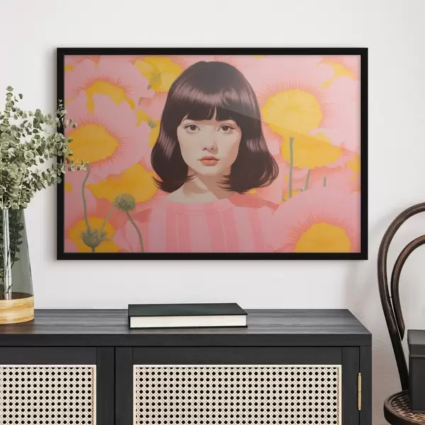 Poster Dekorativní minimalistický portrét asijské dívky v poli žlutých a růžových květů f44924