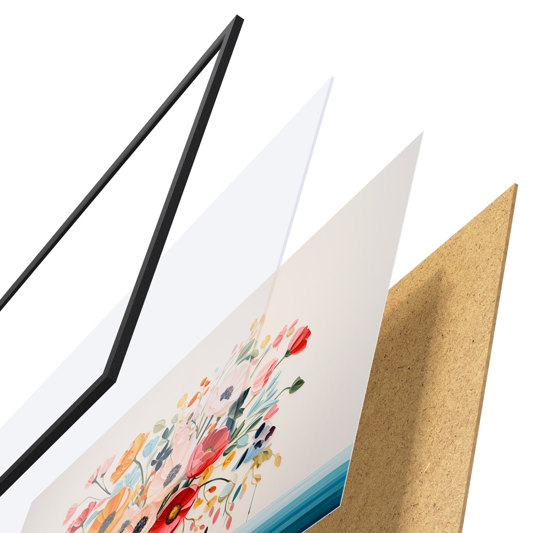 Plakát se skládá z rámu, plexiskla, tištěného obrazu a dřevotřískového podkladu. Díky úchytům na zadní straně lze plakát ihned zavěsit na zeď.