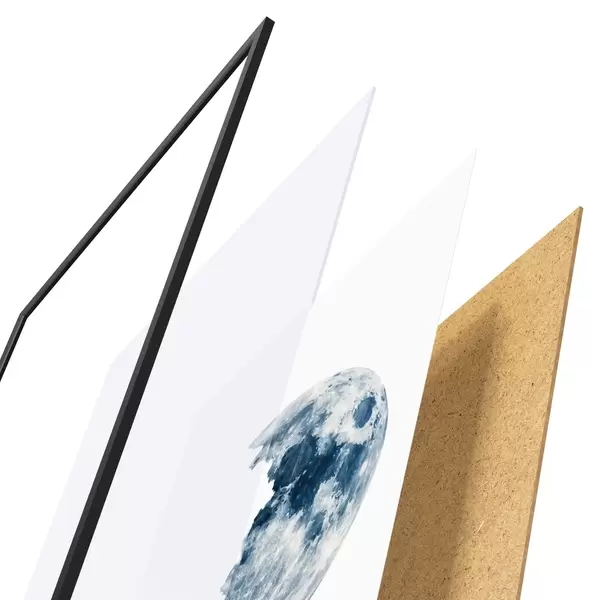 Plakát se skládá z rámu, plexiskla, tištěného obrazu a dřevotřískového podkladu. Díky úchytům na zadní straně lze plakát ihned zavěsit na zeď.