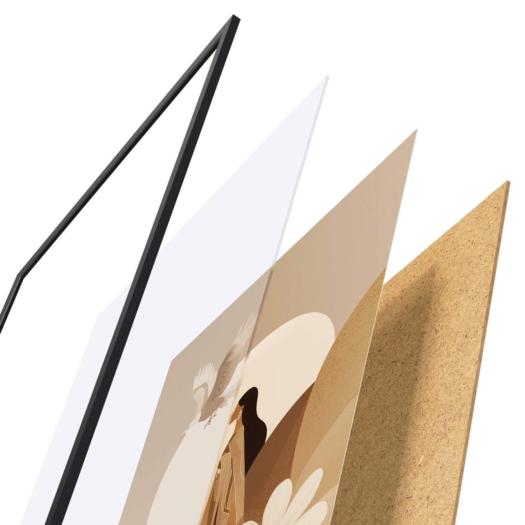 Plakát se skládá z rámu, plexiskla, tištěného obrazu a dřevotřískového podkladu. Díky úchytům na zadní straně lze plakát ihned zavěsit na zeď.