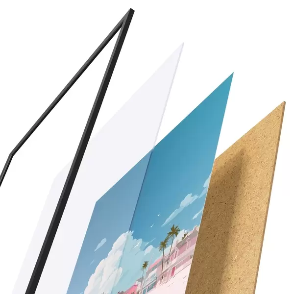 Plakát se skládá z rámu, plexiskla, tištěného obrazu a dřevotřískového podkladu. Díky úchytům na zadní straně lze plakát ihned zavěsit na zeď.