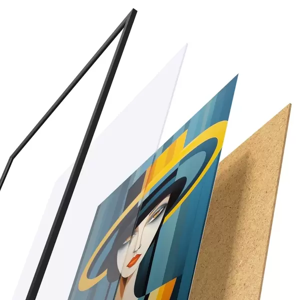 Plakát se skládá z rámu, plexiskla, tištěného obrazu a dřevotřískového podkladu. Díky úchytům na zadní straně lze plakát ihned zavěsit na zeď.
