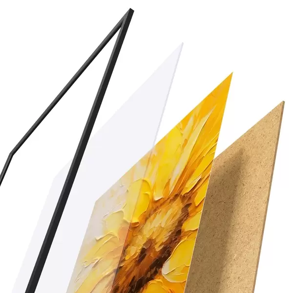 Plakát se skládá z rámu, plexiskla, tištěného obrazu a dřevotřískového podkladu. Díky úchytům na zadní straně lze plakát ihned zavěsit na zeď.