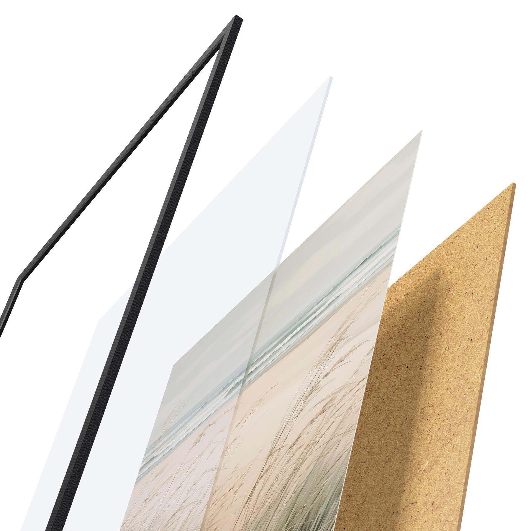 Plakát se skládá z rámu, plexiskla, tištěného obrazu a dřevotřískového podkladu. Díky úchytům na zadní straně lze plakát ihned zavěsit na zeď.