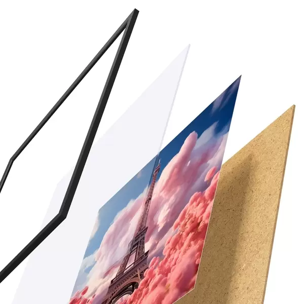 Plakát se skládá z rámu, plexiskla, tištěného obrazu a dřevotřískového podkladu. Díky úchytům na zadní straně lze plakát ihned zavěsit na zeď.
