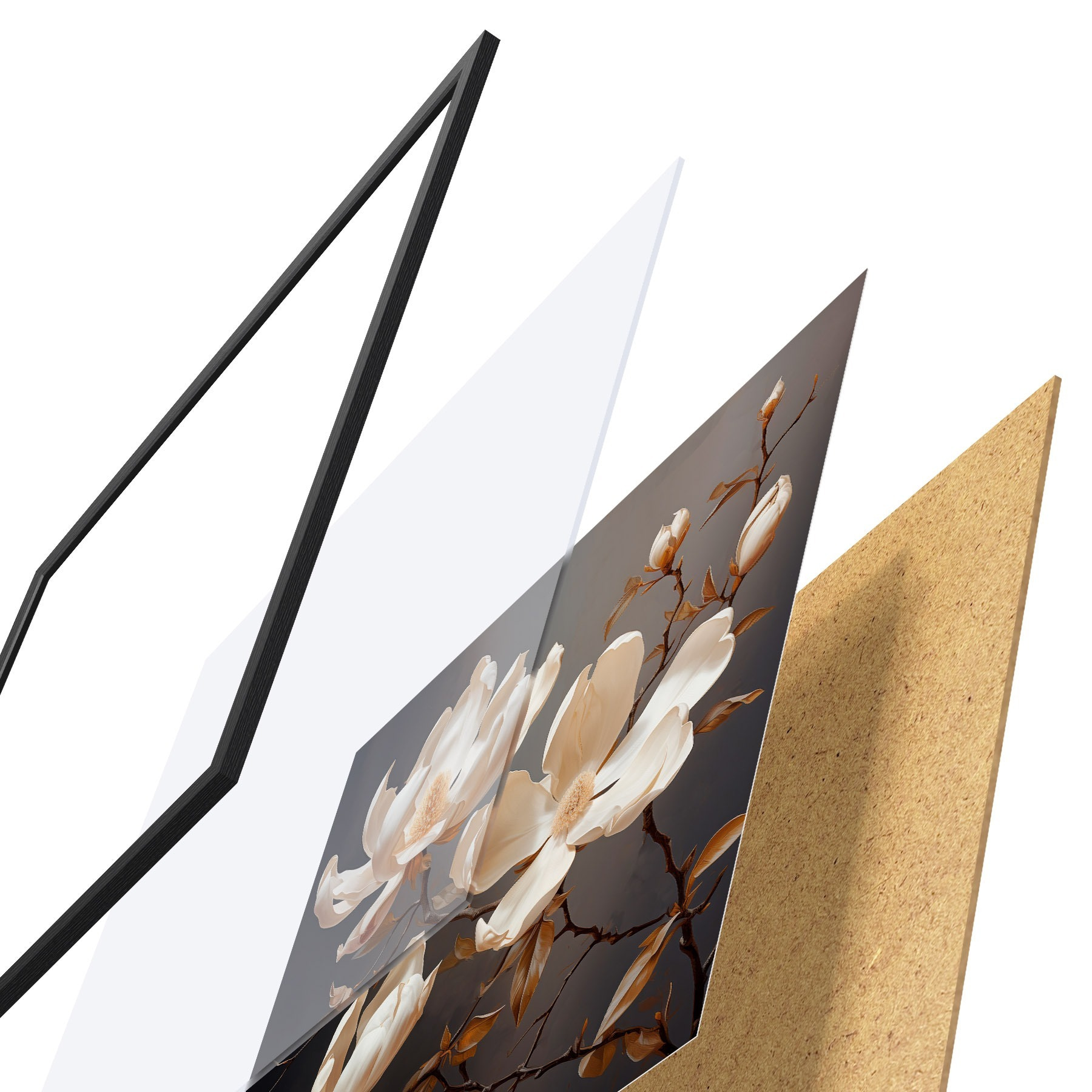 Plakát se skládá z rámu, plexiskla, tištěného obrazu a dřevotřískového podkladu. Díky úchytům na zadní straně lze plakát ihned zavěsit na zeď.
