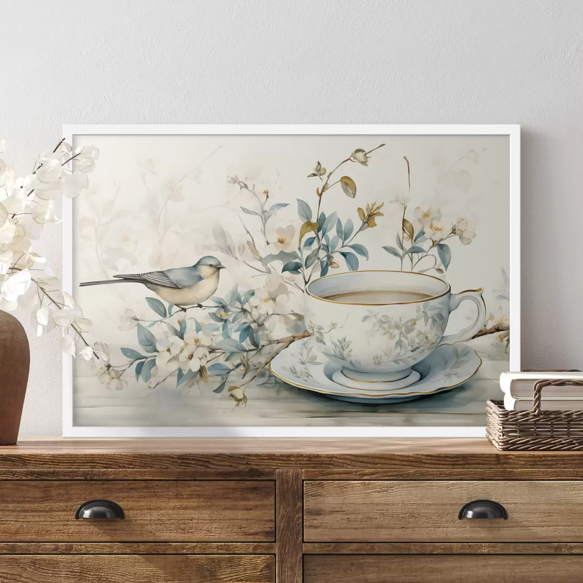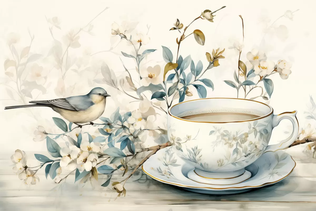 Poster Pták na větvi s květy u šálku v pastelových tónech Č. f45047