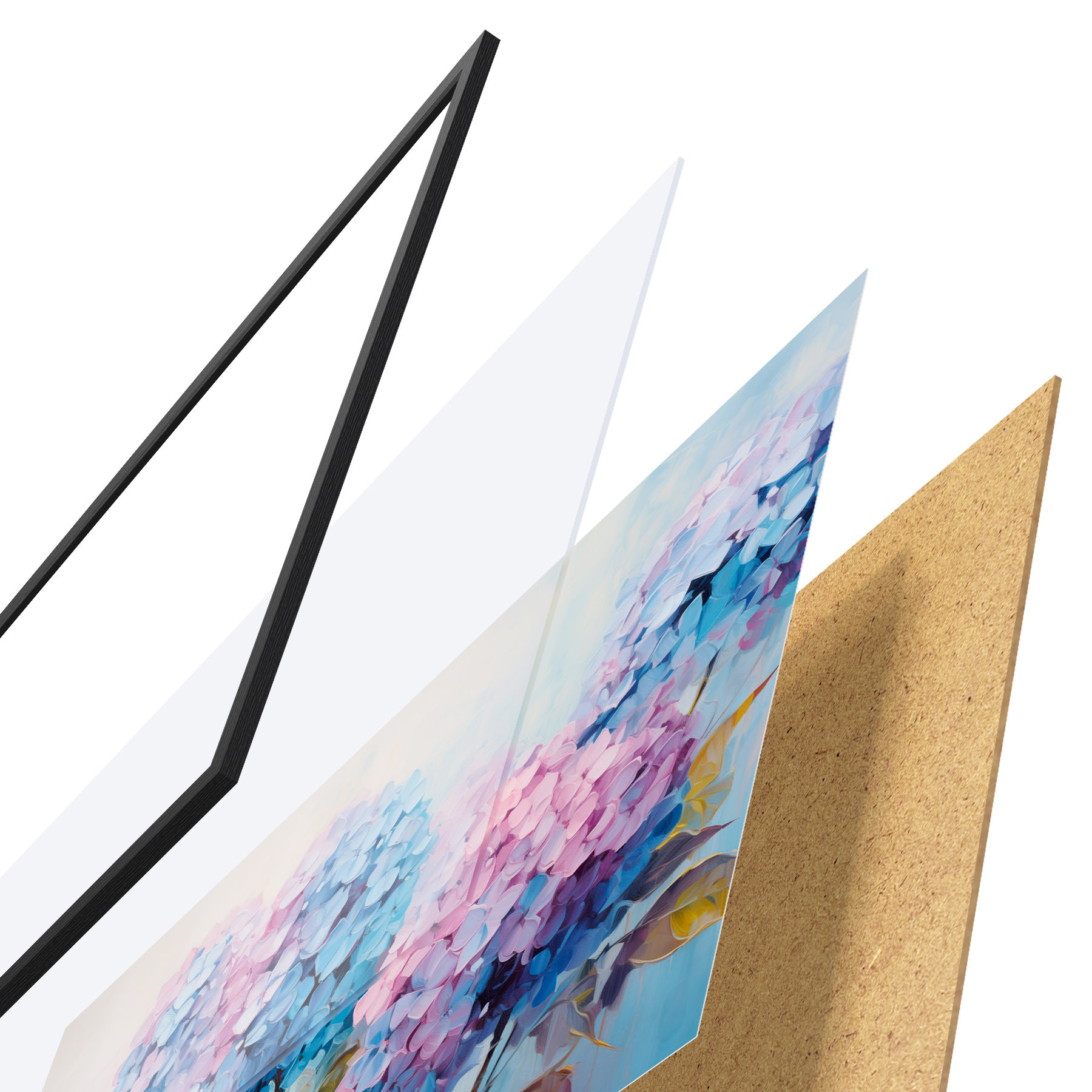 Plakát se skládá z rámu, plexiskla, tištěného obrazu a dřevotřískového podkladu. Díky úchytům na zadní straně lze plakát ihned zavěsit na zeď.
