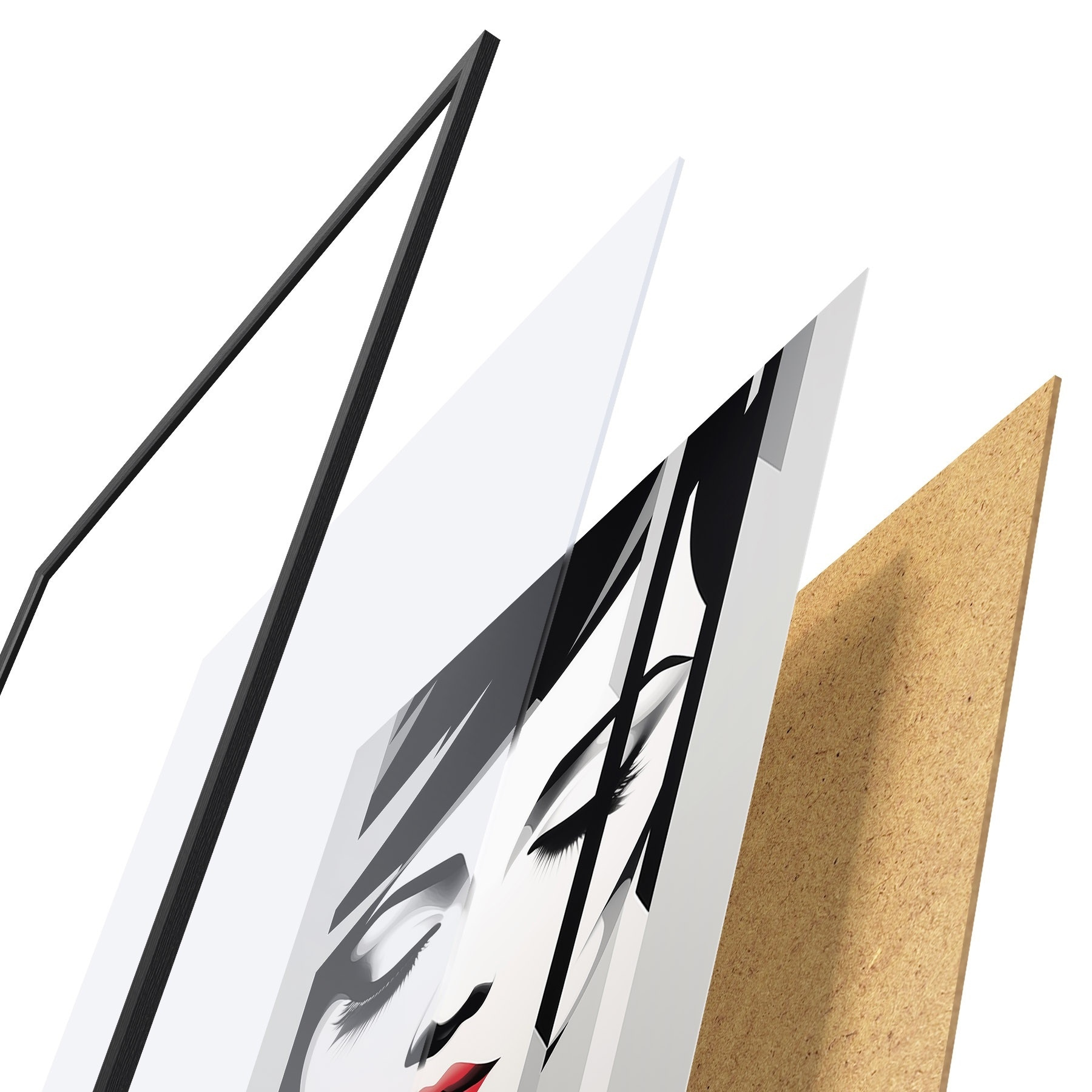 Plakát se skládá z rámu, plexiskla, tištěného obrazu a dřevotřískového podkladu. Díky úchytům na zadní straně lze plakát ihned zavěsit na zeď.