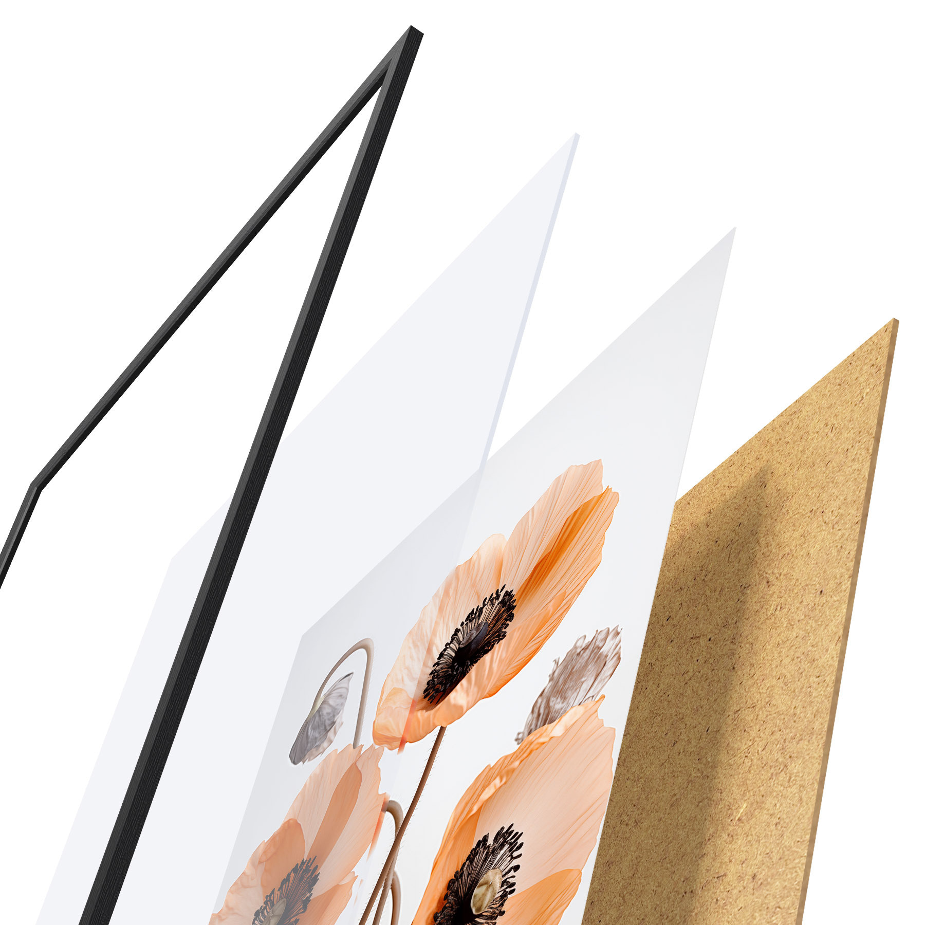 Plakát se skládá z rámu, plexiskla, tištěného obrazu a dřevotřískového podkladu. Díky úchytům na zadní straně lze plakát ihned zavěsit na zeď.
