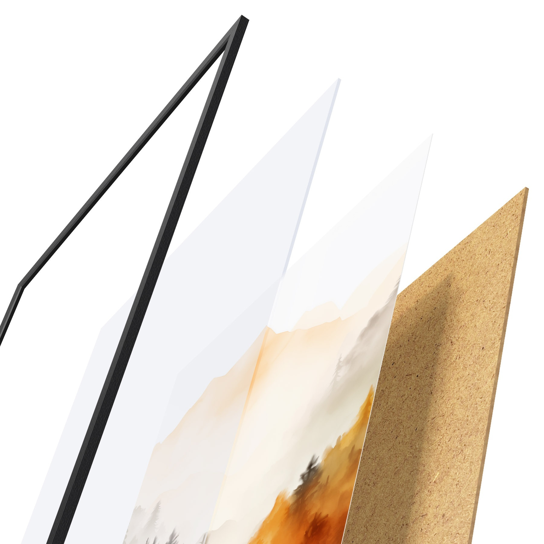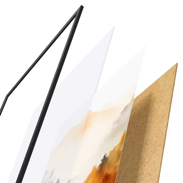 Plakát se skládá z rámu, plexiskla, tištěného obrazu a dřevotřískového podkladu. Díky úchytům na zadní straně lze plakát ihned zavěsit na zeď.