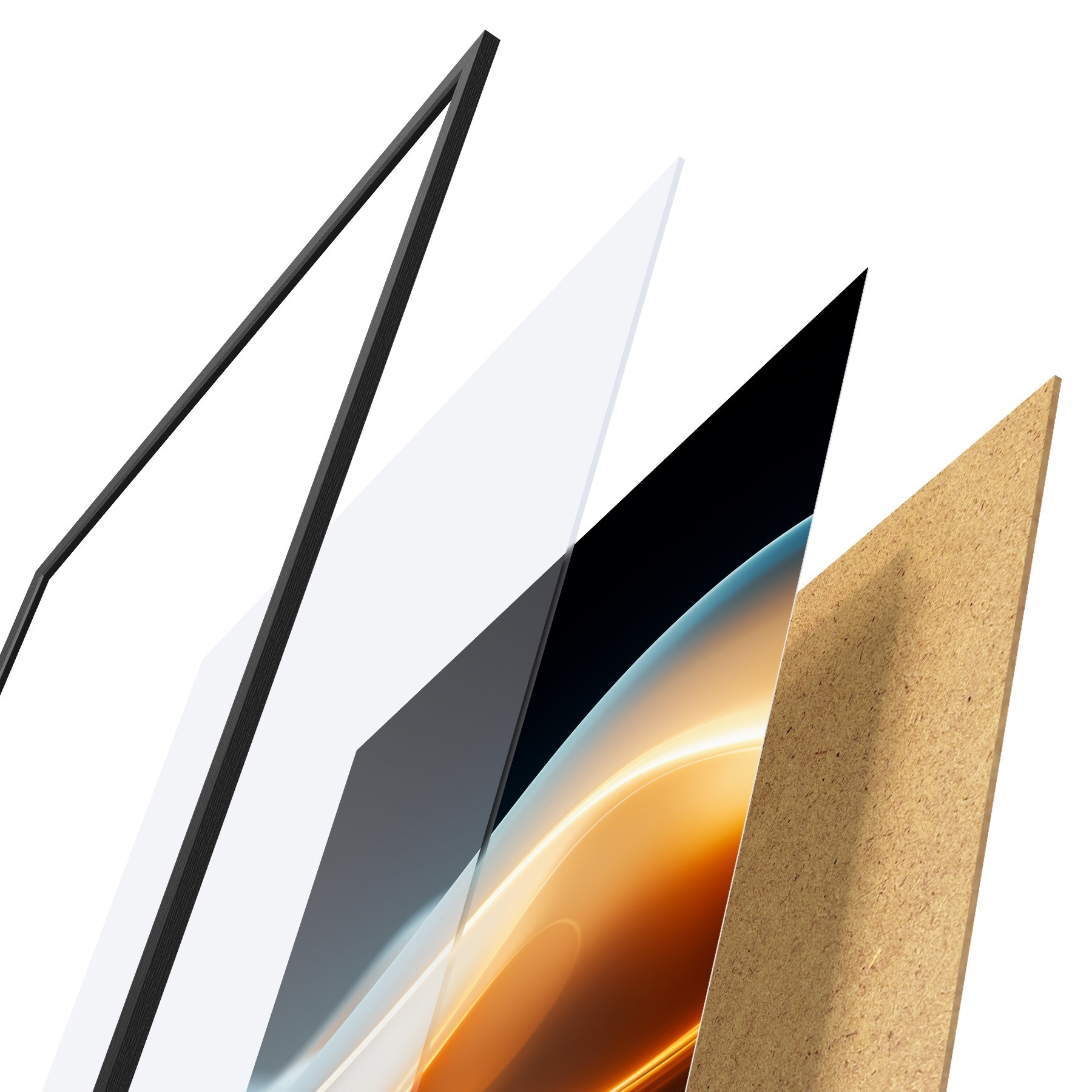 Plakát se skládá z rámu, plexiskla, tištěného obrazu a dřevotřískového podkladu. Díky úchytům na zadní straně lze plakát ihned zavěsit na zeď.