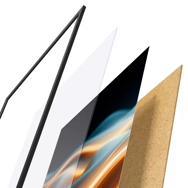 Plakát se skládá z rámu, plexiskla, tištěného obrazu a dřevotřískového podkladu. Díky úchytům na zadní straně lze plakát ihned zavěsit na zeď.