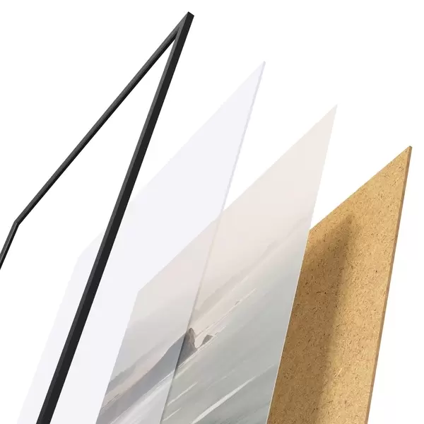 Plakát se skládá z rámu, plexiskla, tištěného obrazu a dřevotřískového podkladu. Díky úchytům na zadní straně lze plakát ihned zavěsit na zeď.