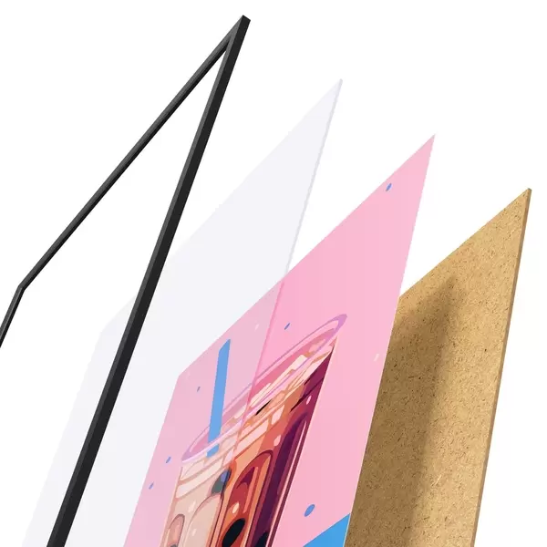 Plakát se skládá z rámu, plexiskla, tištěného obrazu a dřevotřískového podkladu. Díky úchytům na zadní straně lze plakát ihned zavěsit na zeď.