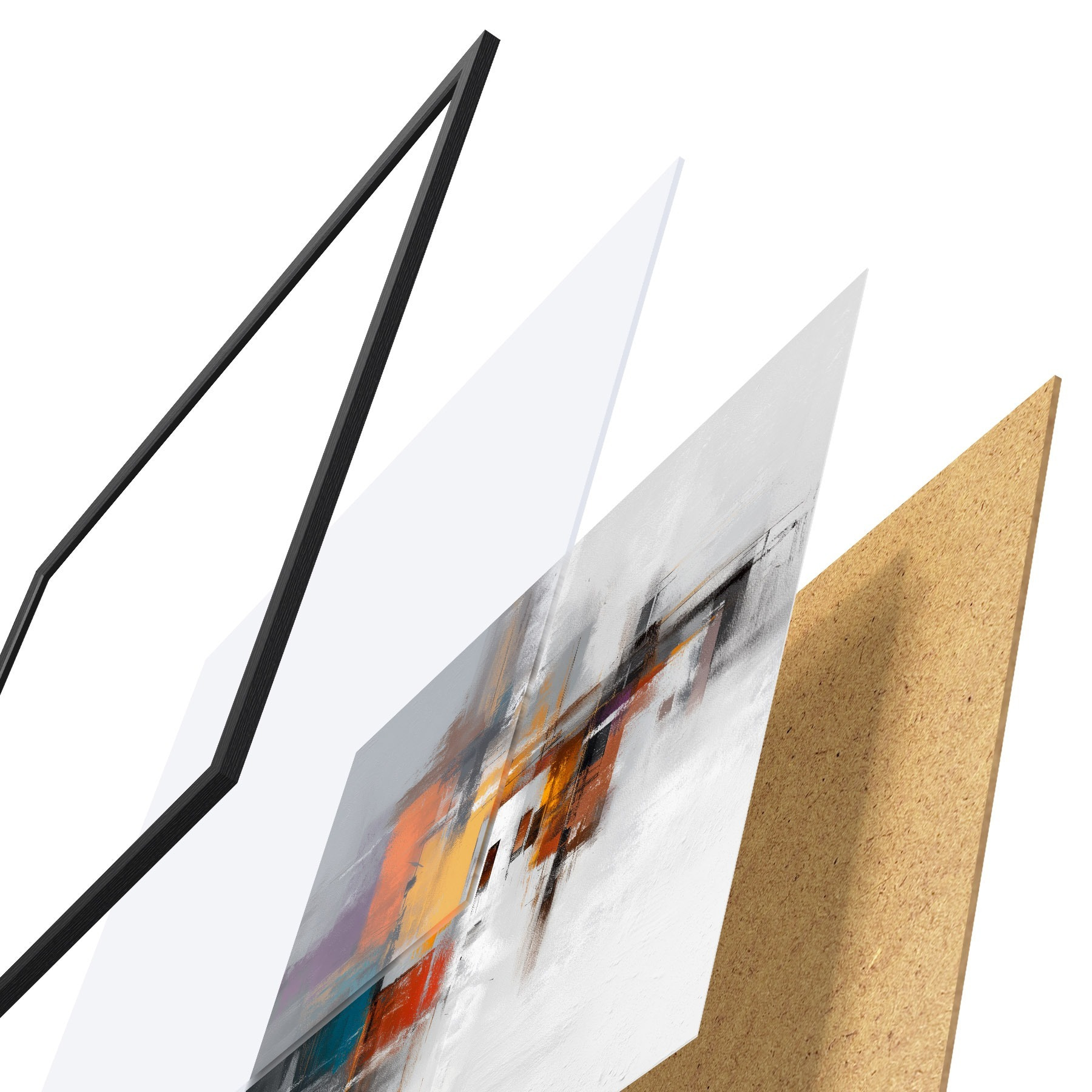 Plakát se skládá z rámu, plexiskla, tištěného obrazu a dřevotřískového podkladu. Díky úchytům na zadní straně lze plakát ihned zavěsit na zeď.