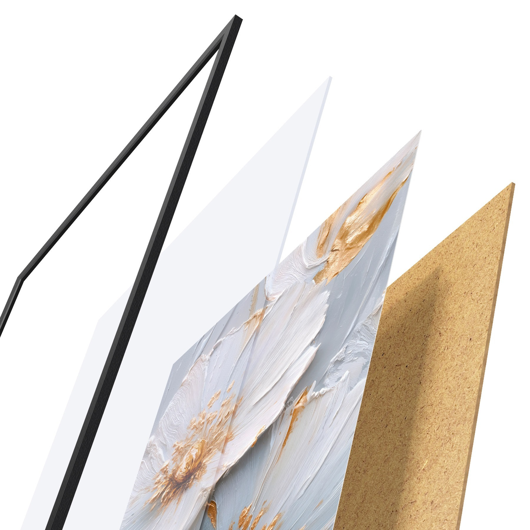 Plakát se skládá z rámu, plexiskla, tištěného obrazu a dřevotřískového podkladu. Díky úchytům na zadní straně lze plakát ihned zavěsit na zeď.