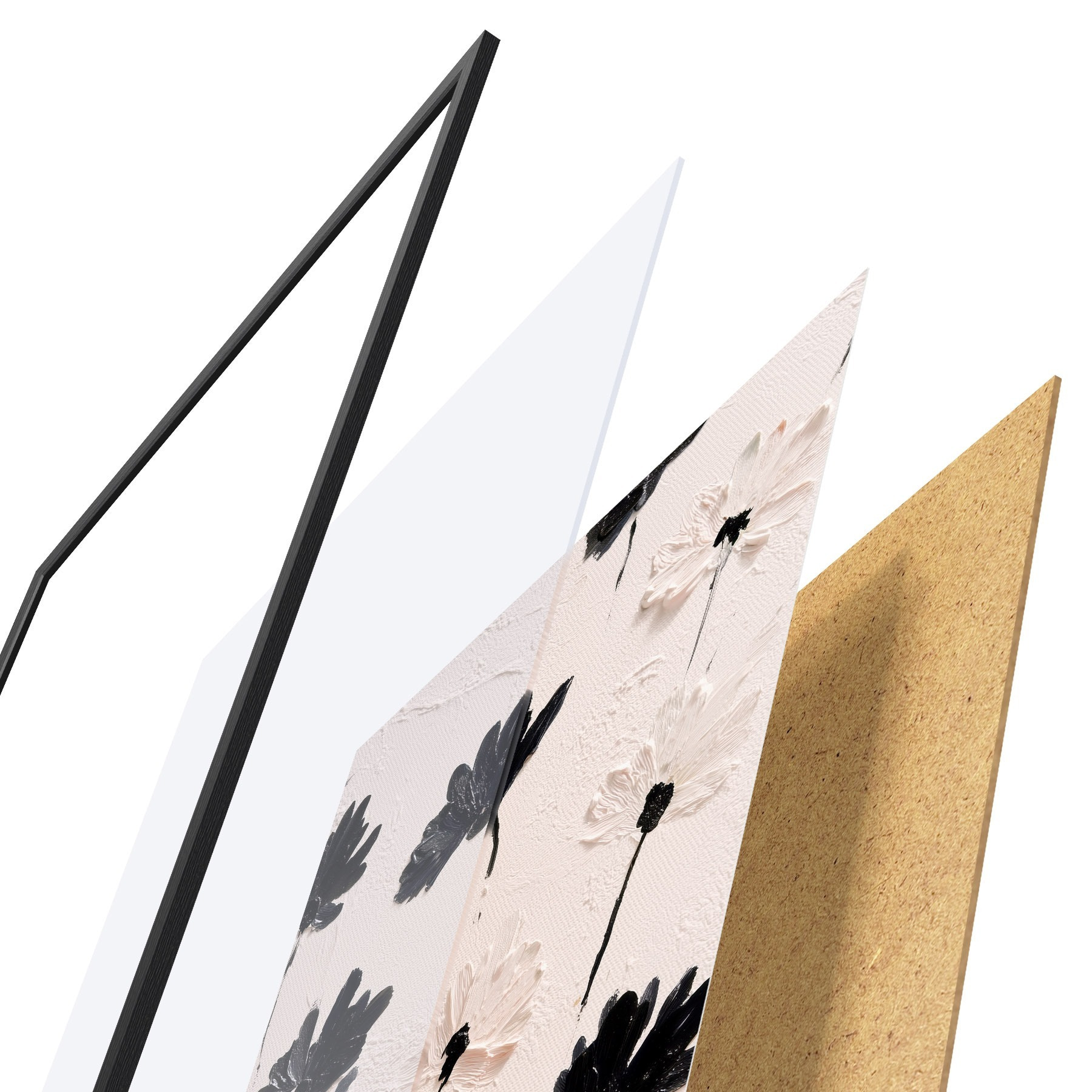 Plakát se skládá z rámu, plexiskla, tištěného obrazu a dřevotřískového podkladu. Díky úchytům na zadní straně lze plakát ihned zavěsit na zeď.