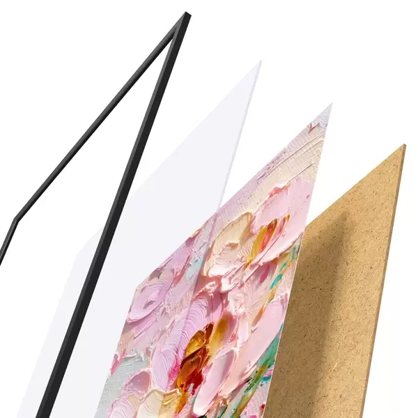 Plakát se skládá z rámu, plexiskla, tištěného obrazu a dřevotřískového podkladu. Díky úchytům na zadní straně lze plakát ihned zavěsit na zeď.