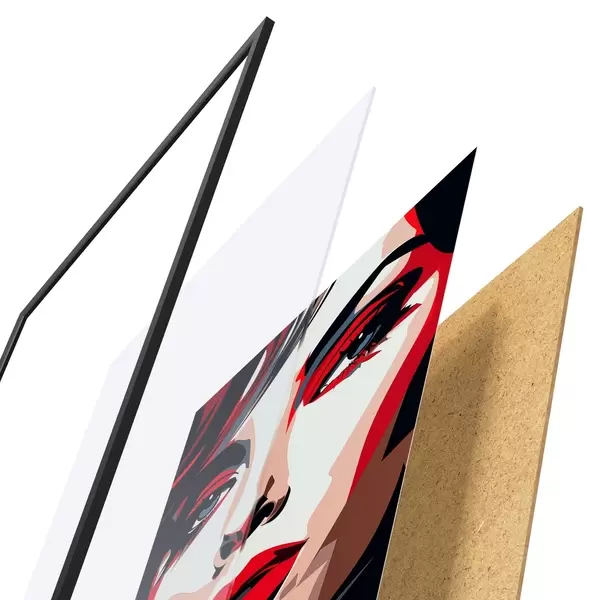 Plakát se skládá z rámu, plexiskla, tištěného obrazu a dřevotřískového podkladu. Díky úchytům na zadní straně lze plakát ihned zavěsit na zeď.
