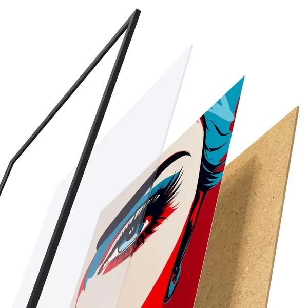 Plakát se skládá z rámu, plexiskla, tištěného obrazu a dřevotřískového podkladu. Díky úchytům na zadní straně lze plakát ihned zavěsit na zeď.