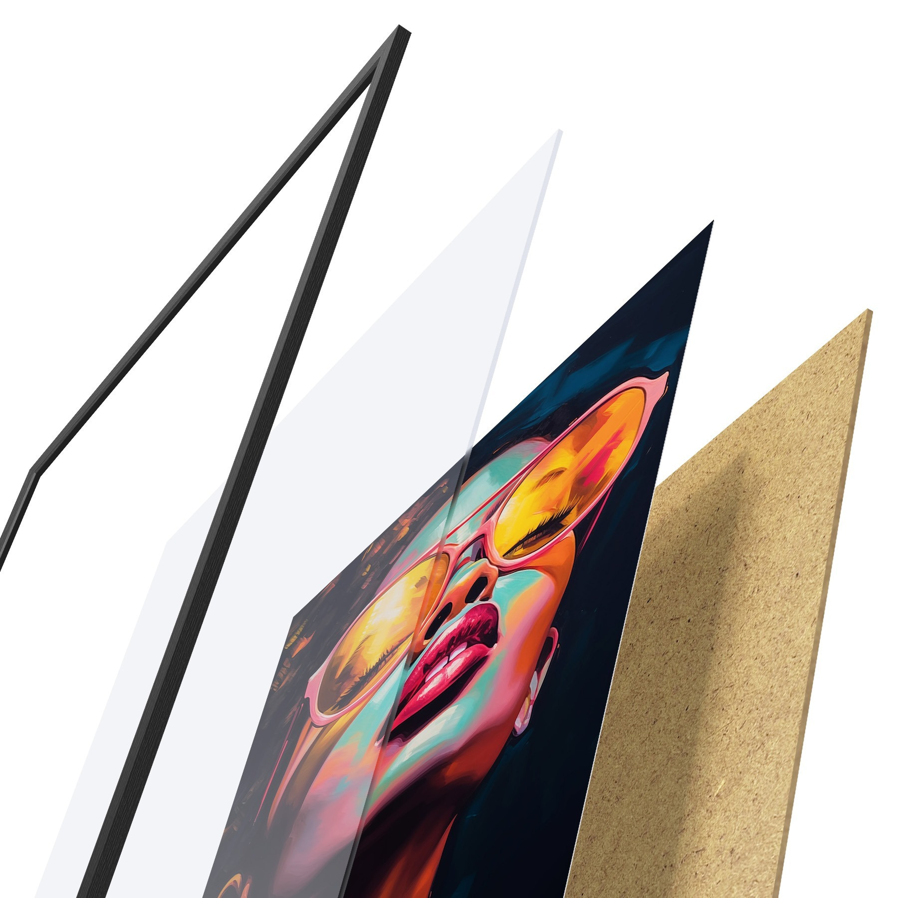 Plakát se skládá z rámu, plexiskla, tištěného obrazu a dřevotřískového podkladu. Díky úchytům na zadní straně lze plakát ihned zavěsit na zeď.