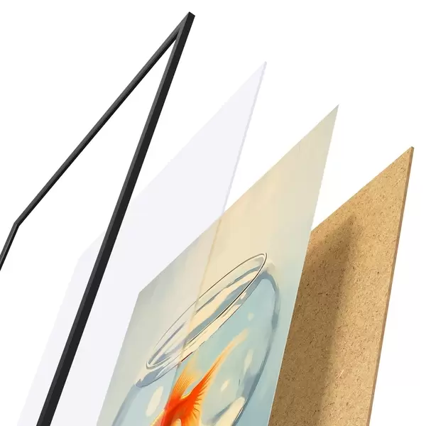 Plakát se skládá z rámu, plexiskla, tištěného obrazu a dřevotřískového podkladu. Díky úchytům na zadní straně lze plakát ihned zavěsit na zeď.