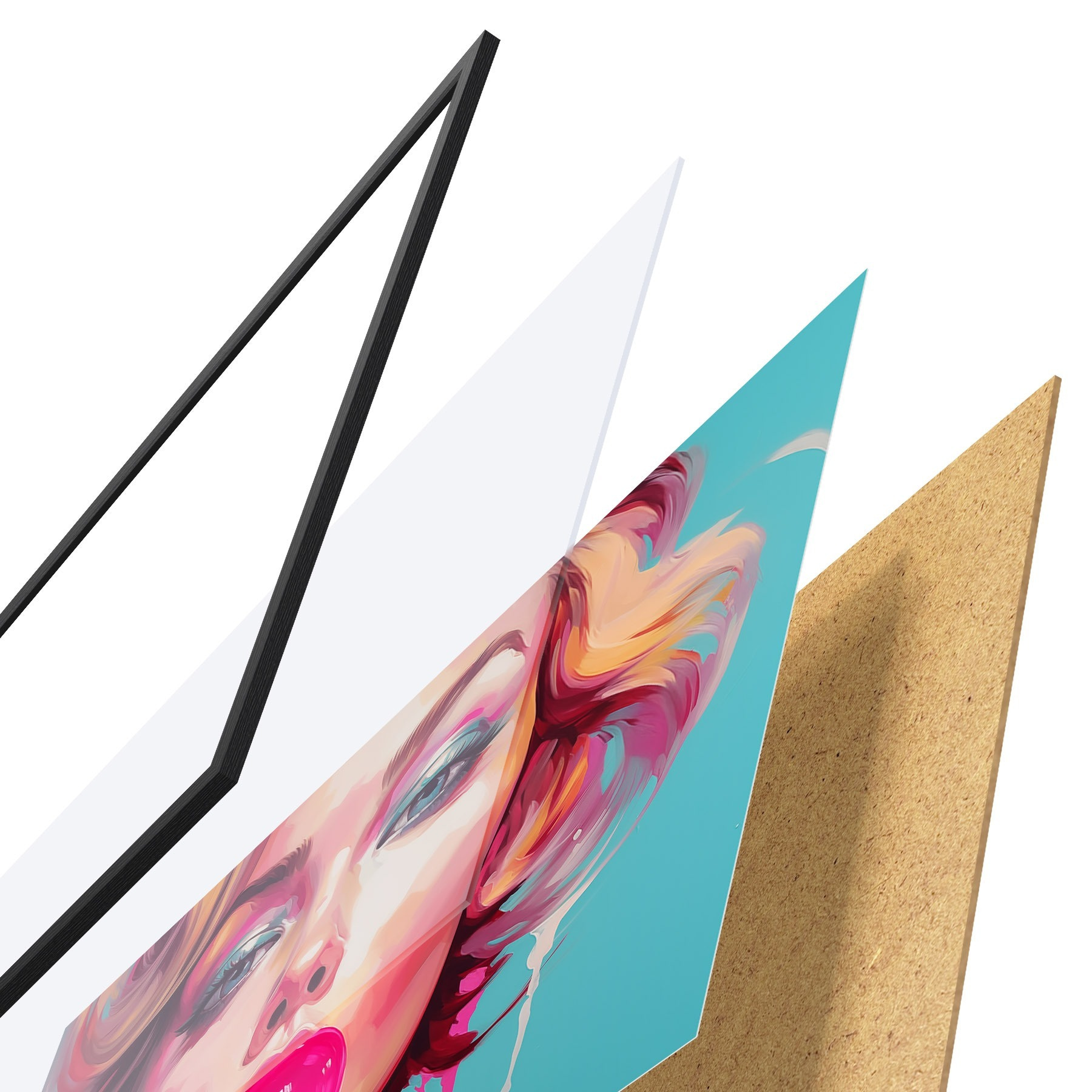 Plakát se skládá z rámu, plexiskla, tištěného obrazu a dřevotřískového podkladu. Díky úchytům na zadní straně lze plakát ihned zavěsit na zeď.