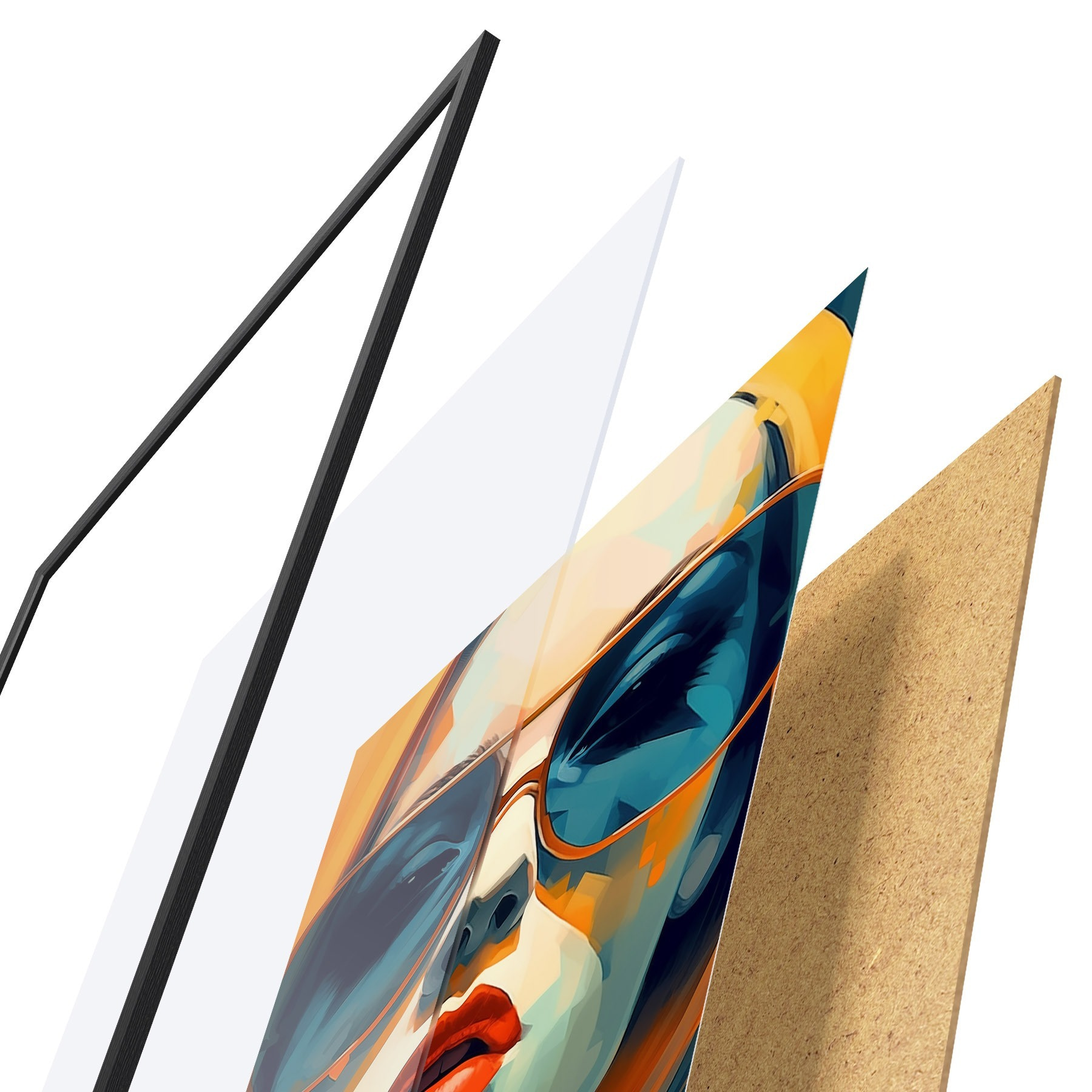 Plakát se skládá z rámu, plexiskla, tištěného obrazu a dřevotřískového podkladu. Díky úchytům na zadní straně lze plakát ihned zavěsit na zeď.