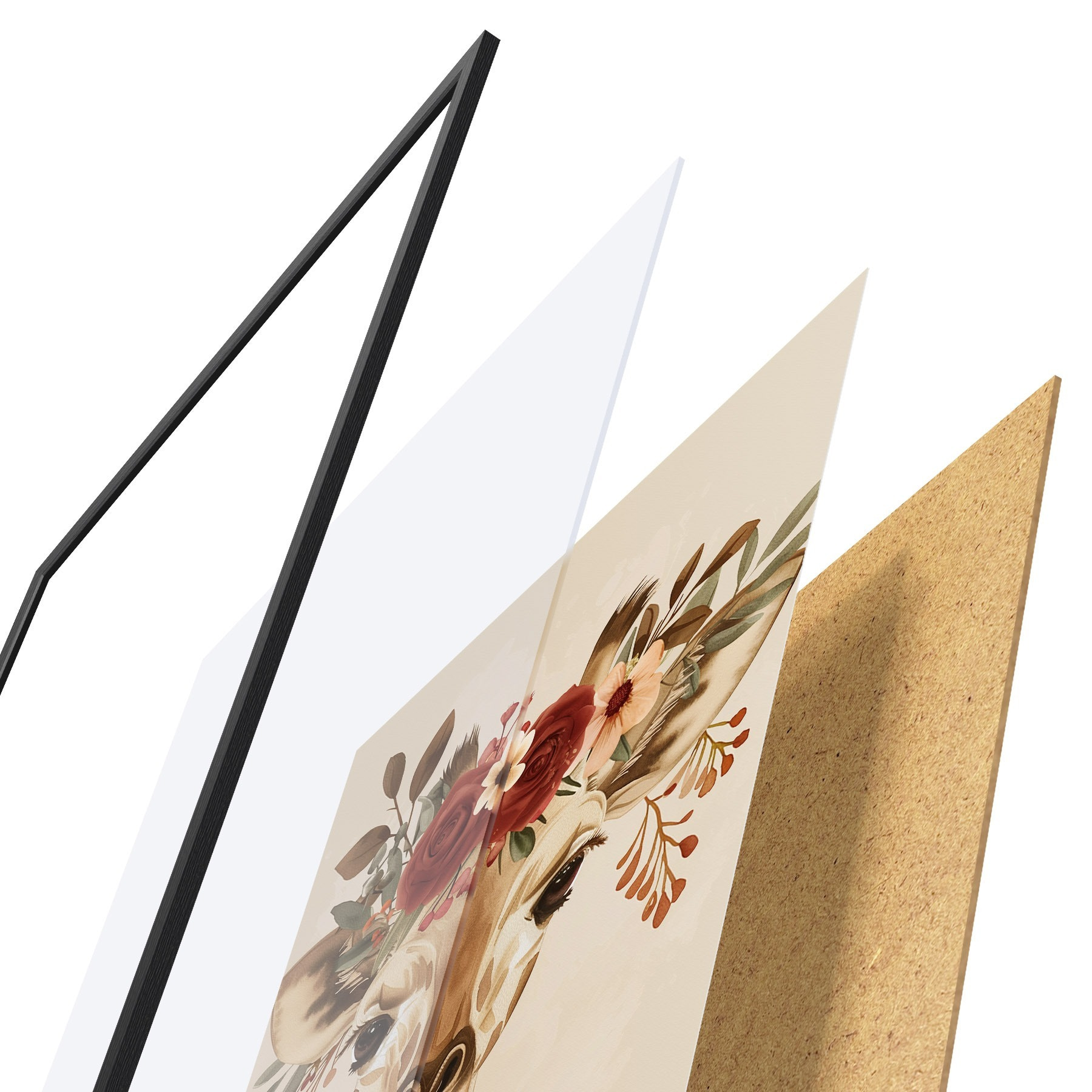 Plakát se skládá z rámu, plexiskla, tištěného obrazu a dřevotřískového podkladu. Díky úchytům na zadní straně lze plakát ihned zavěsit na zeď.