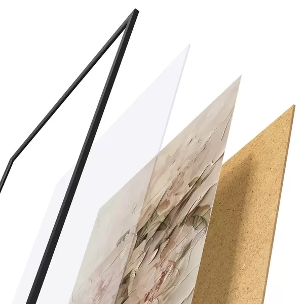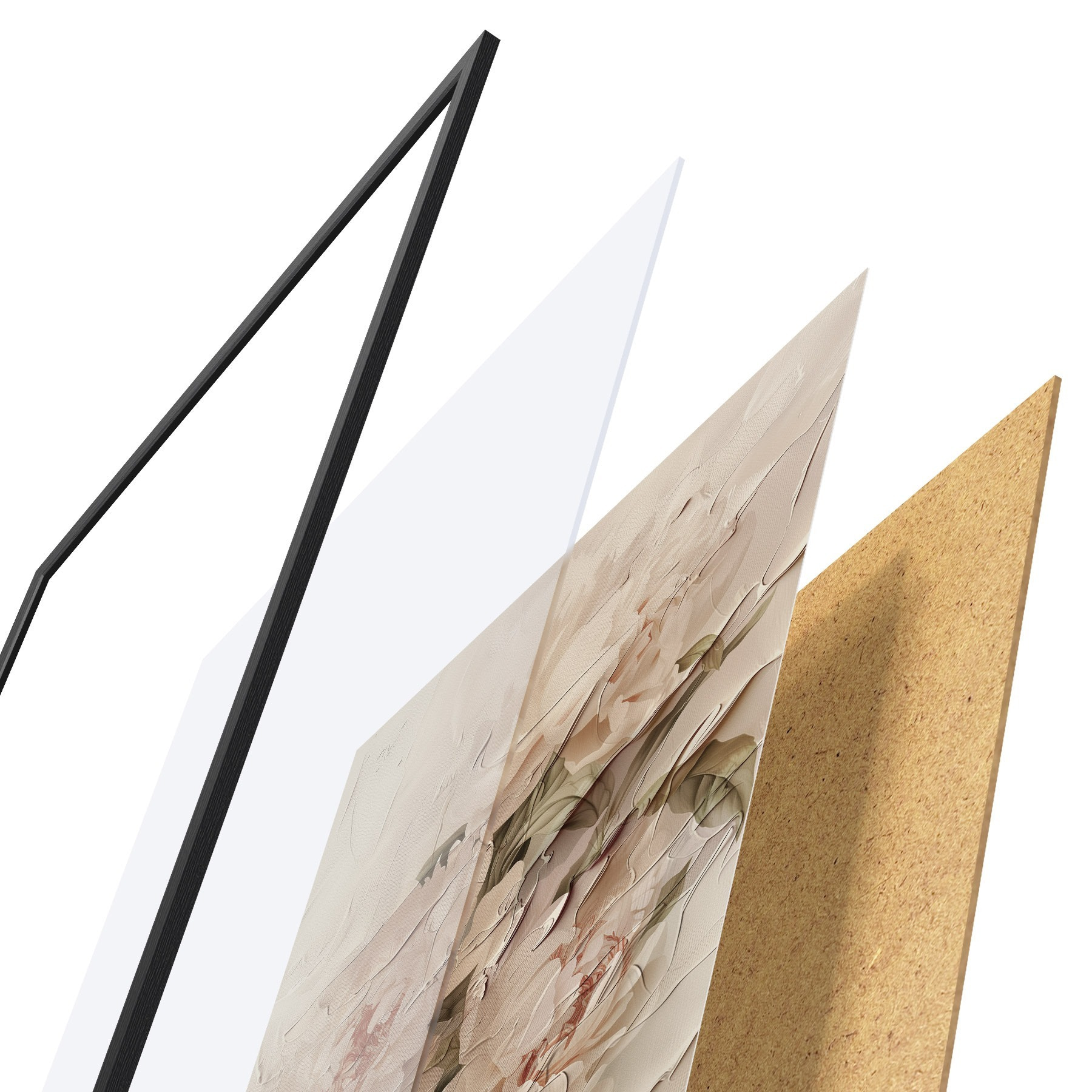Plakát se skládá z rámu, plexiskla, tištěného obrazu a dřevotřískového podkladu. Díky úchytům na zadní straně lze plakát ihned zavěsit na zeď.