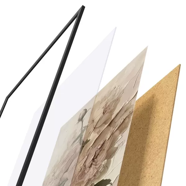 Plakát se skládá z rámu, plexiskla, tištěného obrazu a dřevotřískového podkladu. Díky úchytům na zadní straně lze plakát ihned zavěsit na zeď.