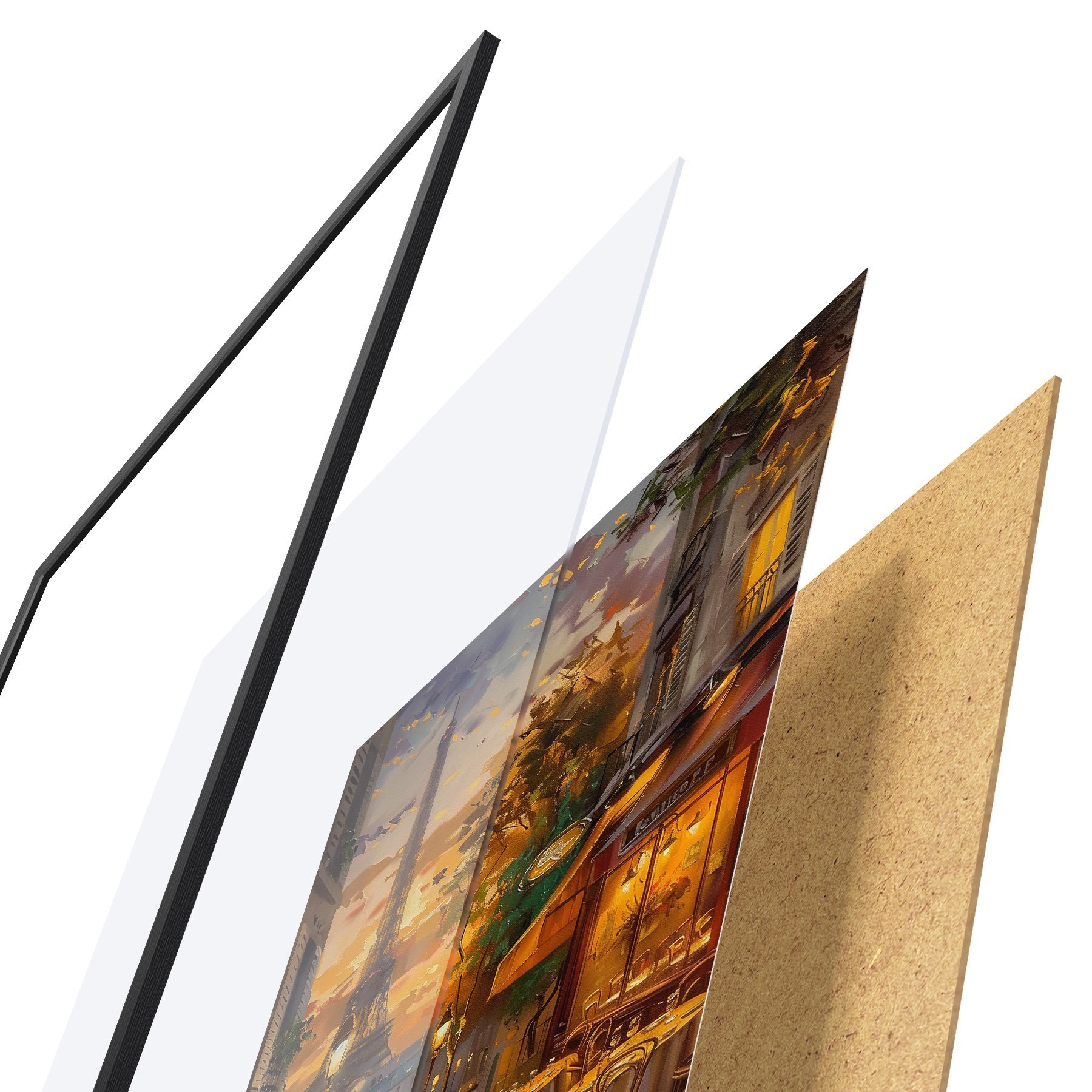 Plakát se skládá z rámu, plexiskla, tištěného obrazu a dřevotřískového podkladu. Díky úchytům na zadní straně lze plakát ihned zavěsit na zeď.