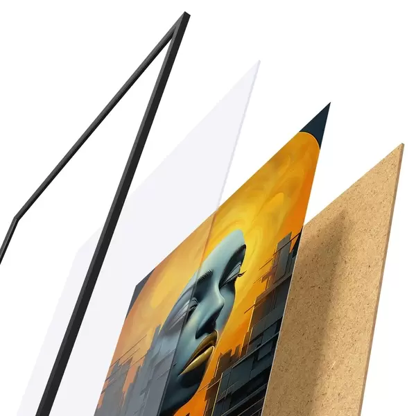 Plakát se skládá z rámu, plexiskla, tištěného obrazu a dřevotřískového podkladu. Díky úchytům na zadní straně lze plakát ihned zavěsit na zeď.