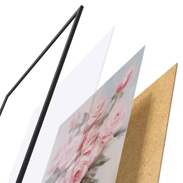 Plakát se skládá z rámu, plexiskla, tištěného obrazu a dřevotřískového podkladu. Díky úchytům na zadní straně lze plakát ihned zavěsit na zeď.
