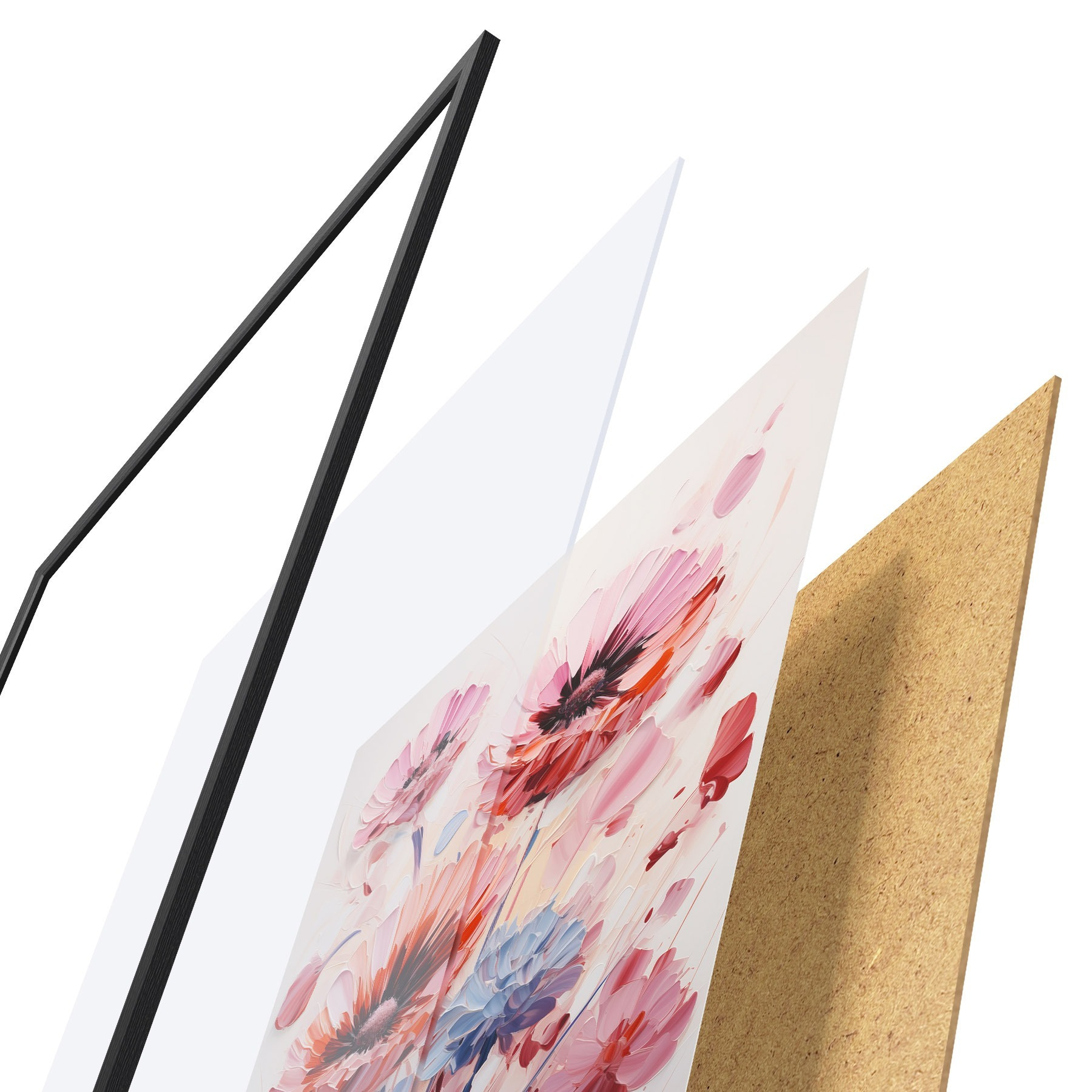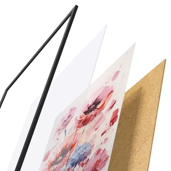 Plakát se skládá z rámu, plexiskla, tištěného obrazu a dřevotřískového podkladu. Díky úchytům na zadní straně lze plakát ihned zavěsit na zeď.