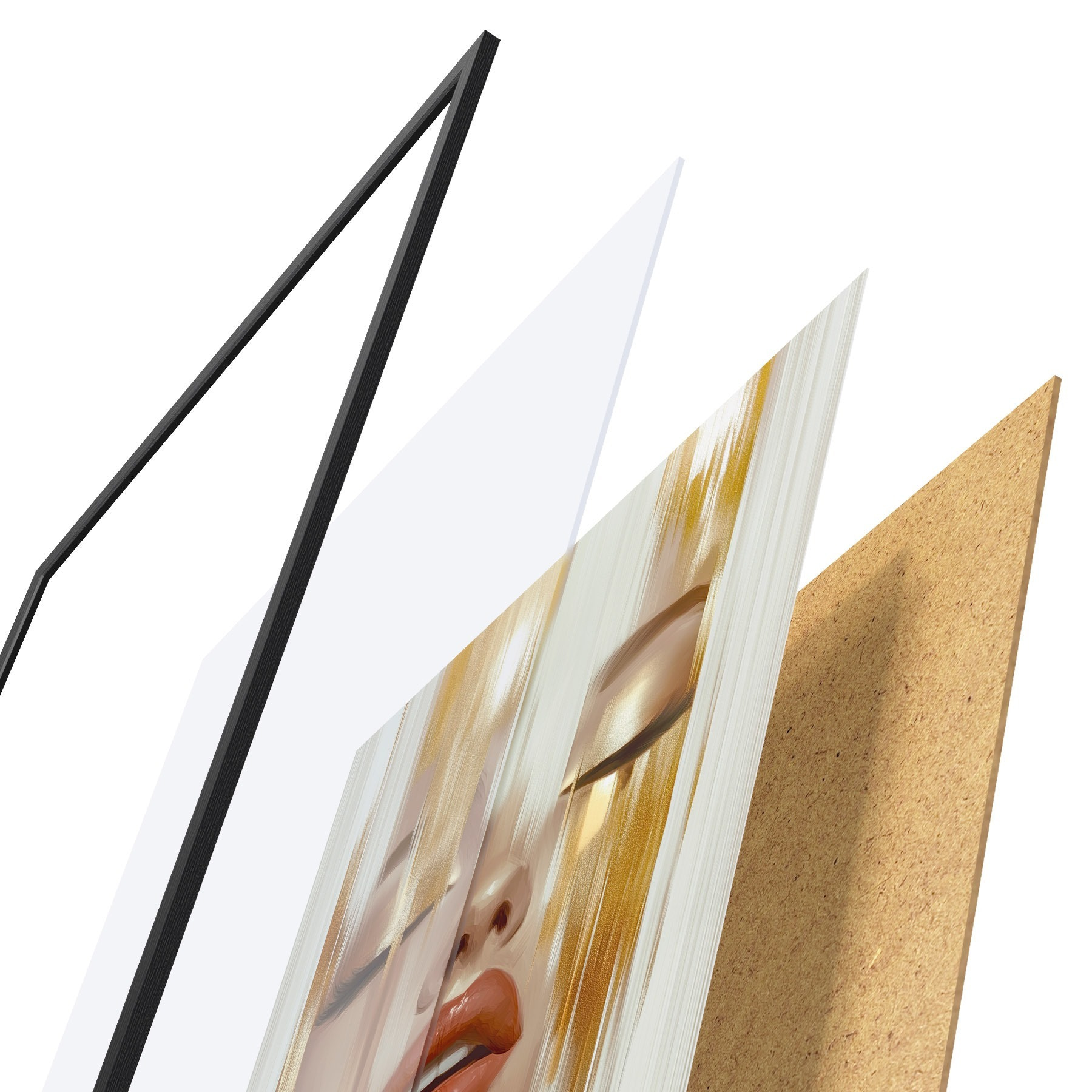 Plakát se skládá z rámu, plexiskla, tištěného obrazu a dřevotřískového podkladu. Díky úchytům na zadní straně lze plakát ihned zavěsit na zeď.