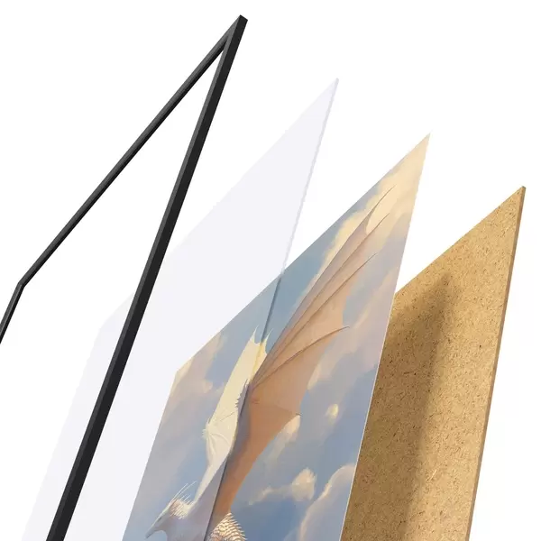 Plakát se skládá z rámu, plexiskla, tištěného obrazu a dřevotřískového podkladu. Díky úchytům na zadní straně lze plakát ihned zavěsit na zeď.