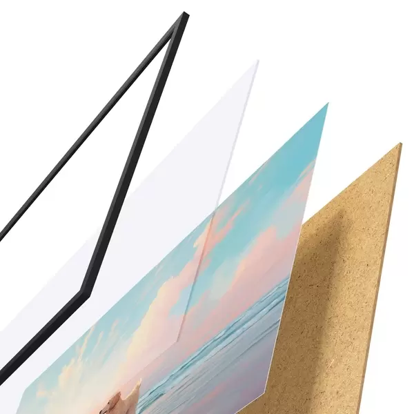 Plakát se skládá z rámu, plexiskla, tištěného obrazu a dřevotřískového podkladu. Díky úchytům na zadní straně lze plakát ihned zavěsit na zeď.