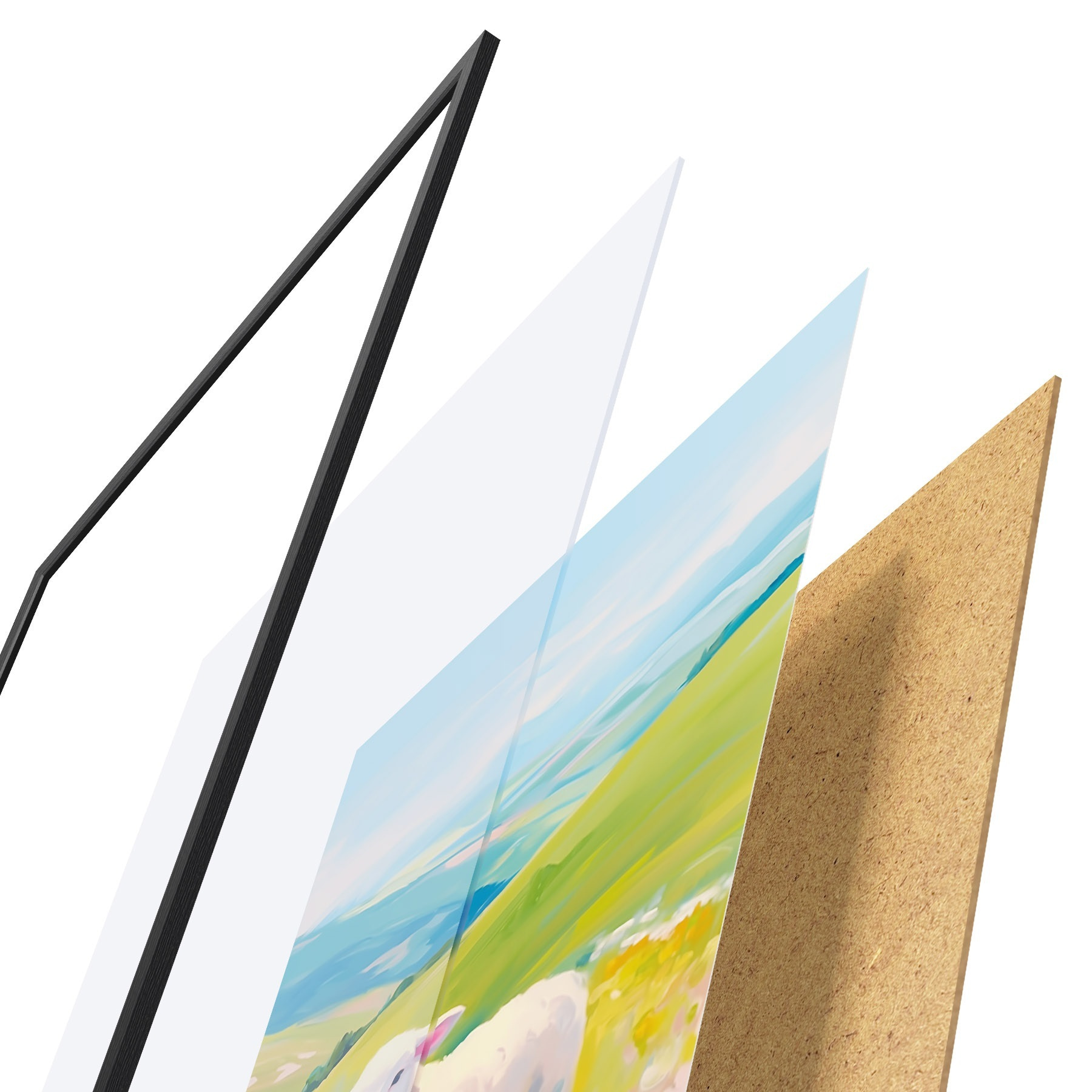 Plakát se skládá z rámu, plexiskla, tištěného obrazu a dřevotřískového podkladu. Díky úchytům na zadní straně lze plakát ihned zavěsit na zeď.
